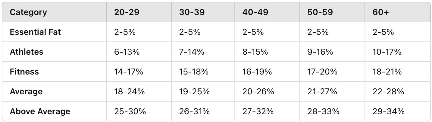Women's Body Fat Percentage Categories by Age